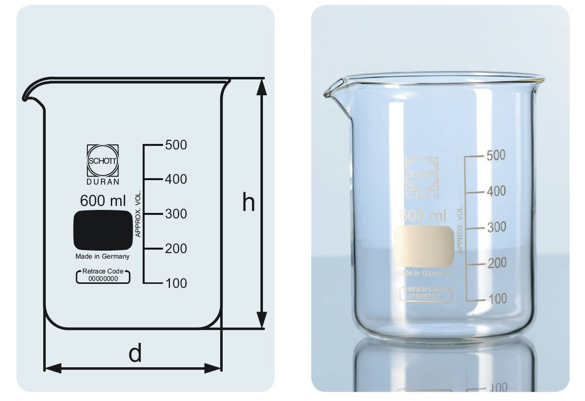 Size: (d×h) 132 × 185 mm, made of Duran glass, with graduation.