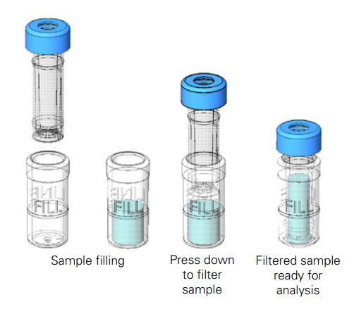 The sample is placed in the outer vial and then passes through the membrane by pressing the inner insert. The filtered, ready-to-use sample can be easily and cleanly transferred from the inner insert thanks to the septum cap.