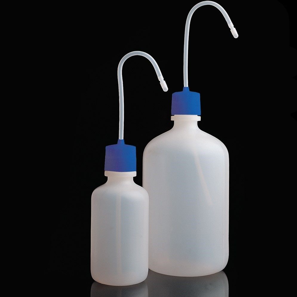 Food contact suitability of the raw material, it has not been tested on the final product. D=75 mm, L=218 mm, d=38 mm. Grad: every 100 ml. Wide mouth for easy, safe filling. Transluscent low density polyethylene bottles, with screw cap and delivery tube. Ribbed caps for a better handling while opening and closing. Ingenious cap designed to avoid involuntary dripping due to pressure build up in bottle - where toxic or radioactive material is being used. Material: PE.